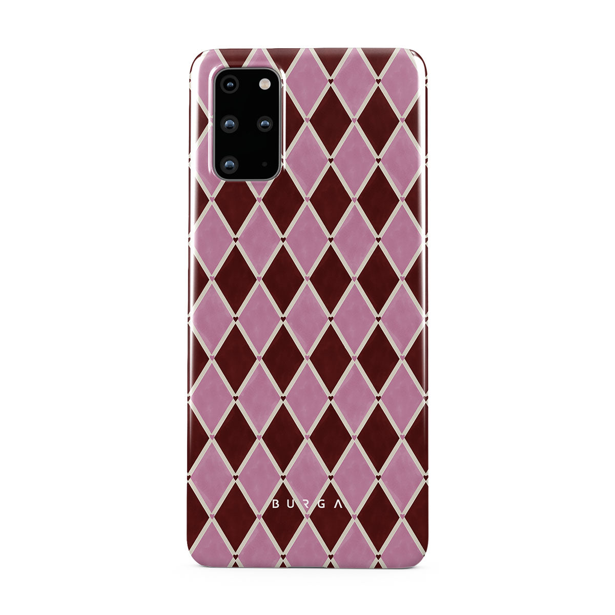 En este diseño: patrón de arlequín, diamantes rosas, fondo rojo profundo