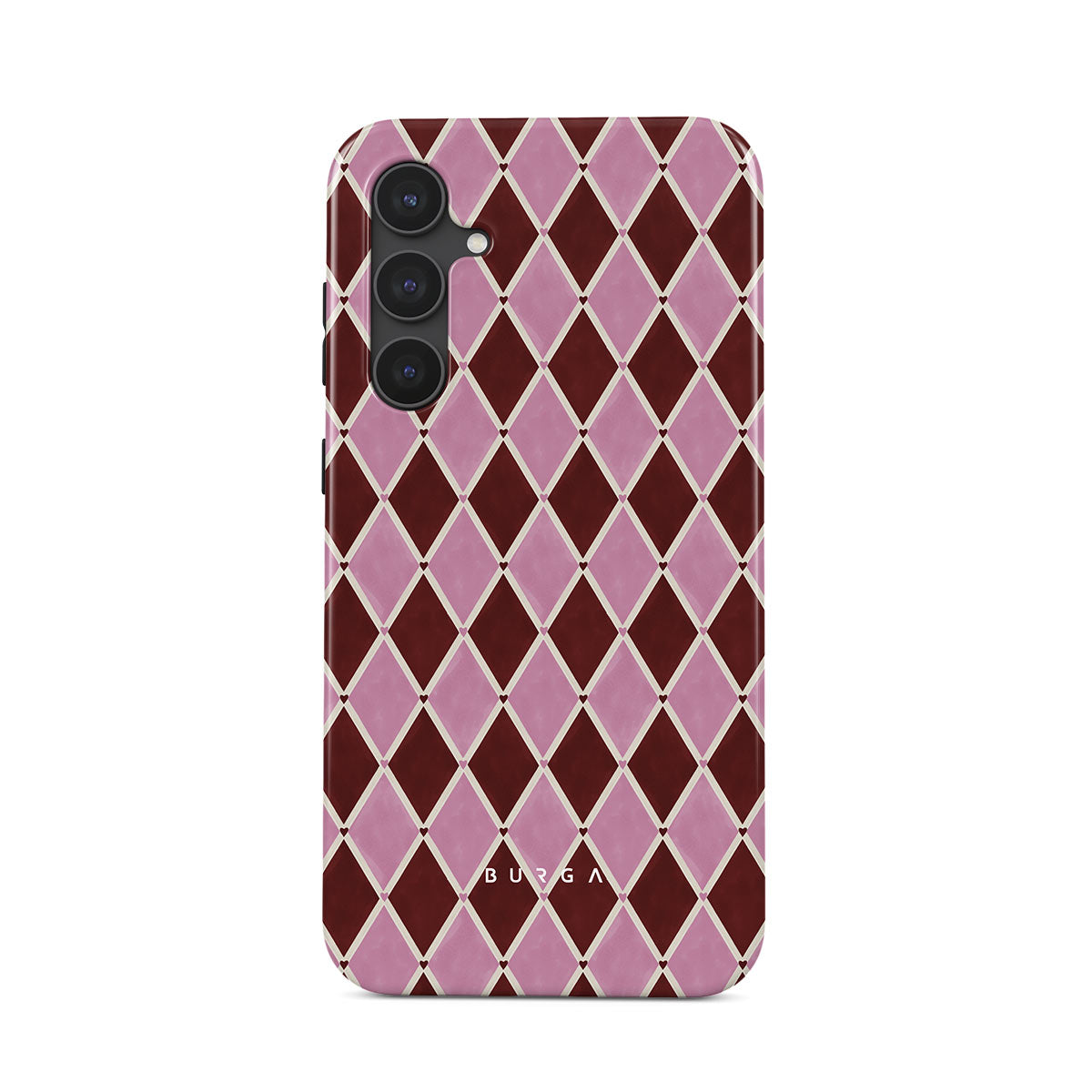 En este diseño: patrón de arlequín, diamantes rosas, fondo rojo profundo