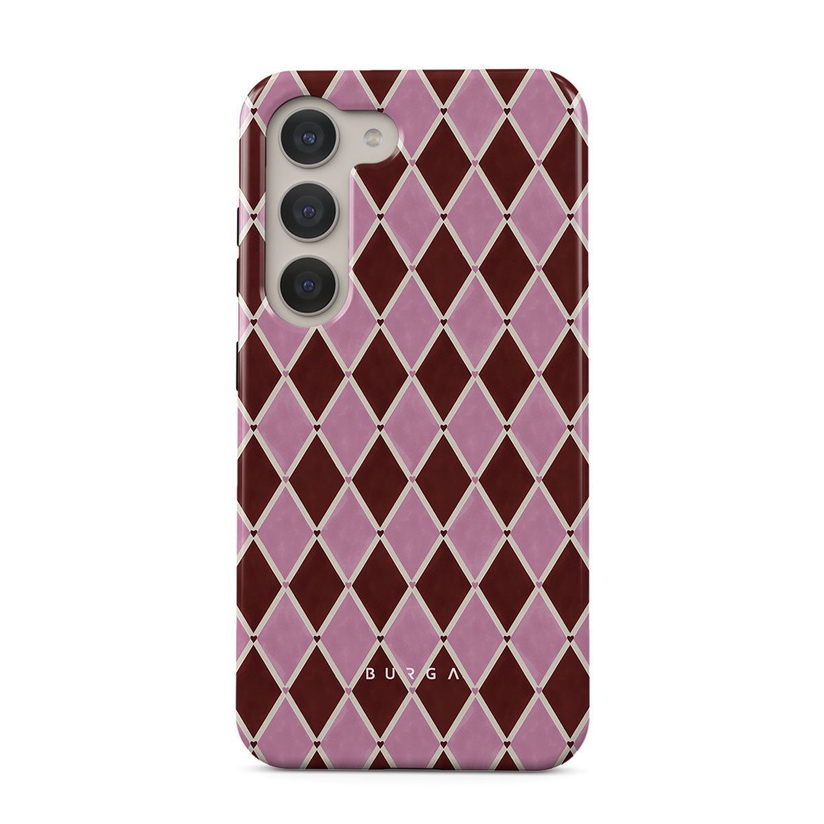 En este diseño: patrón de arlequín, diamantes rosas, fondo rojo profundo