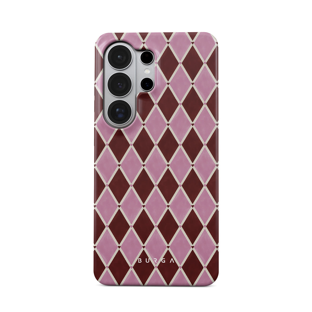 En este diseño: patrón de arlequín, diamantes rosas, fondo rojo profundo