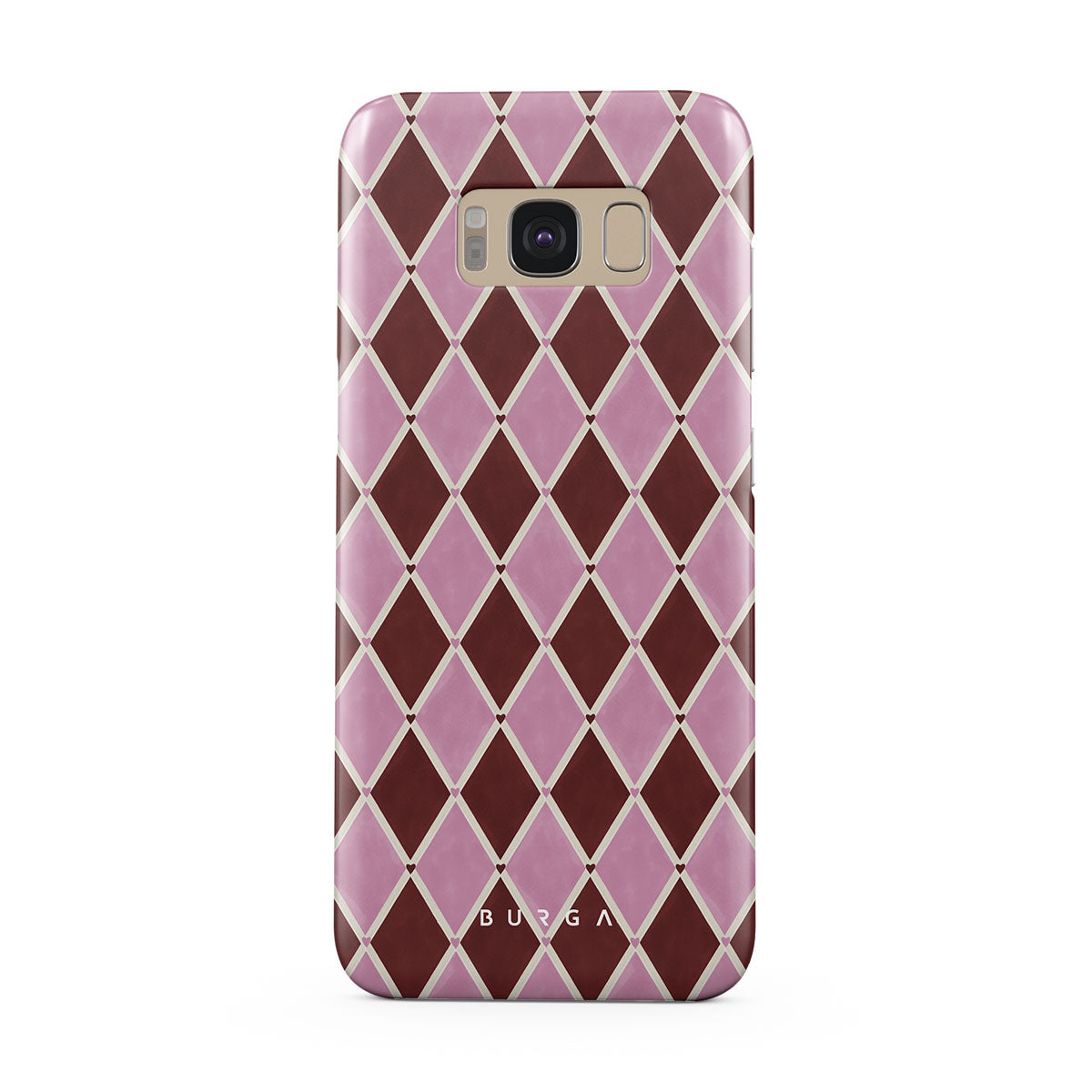 En este diseño: patrón de arlequín, diamantes rosas, fondo rojo profundo