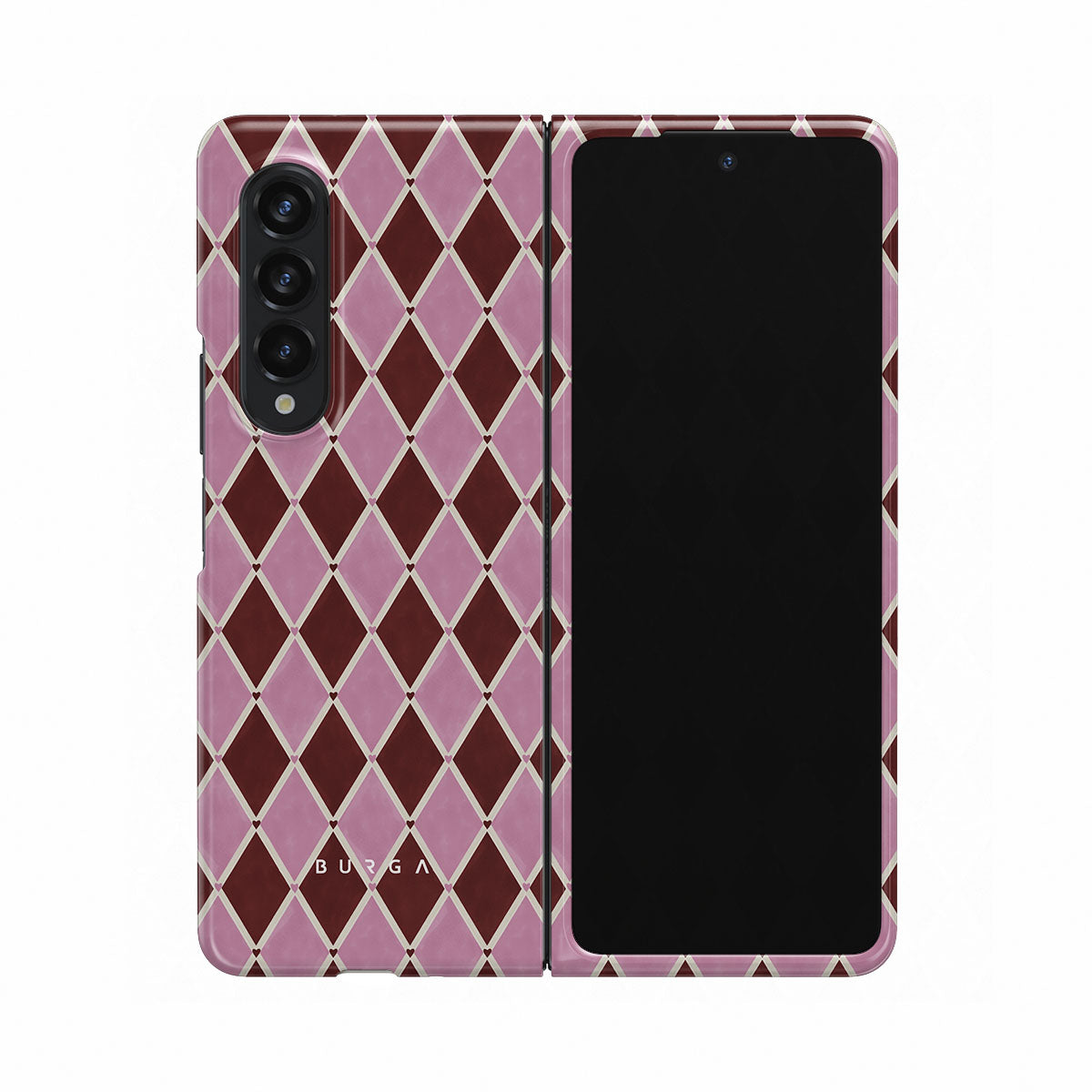 En este diseño: patrón de arlequín, diamantes rosas, fondo rojo profundo