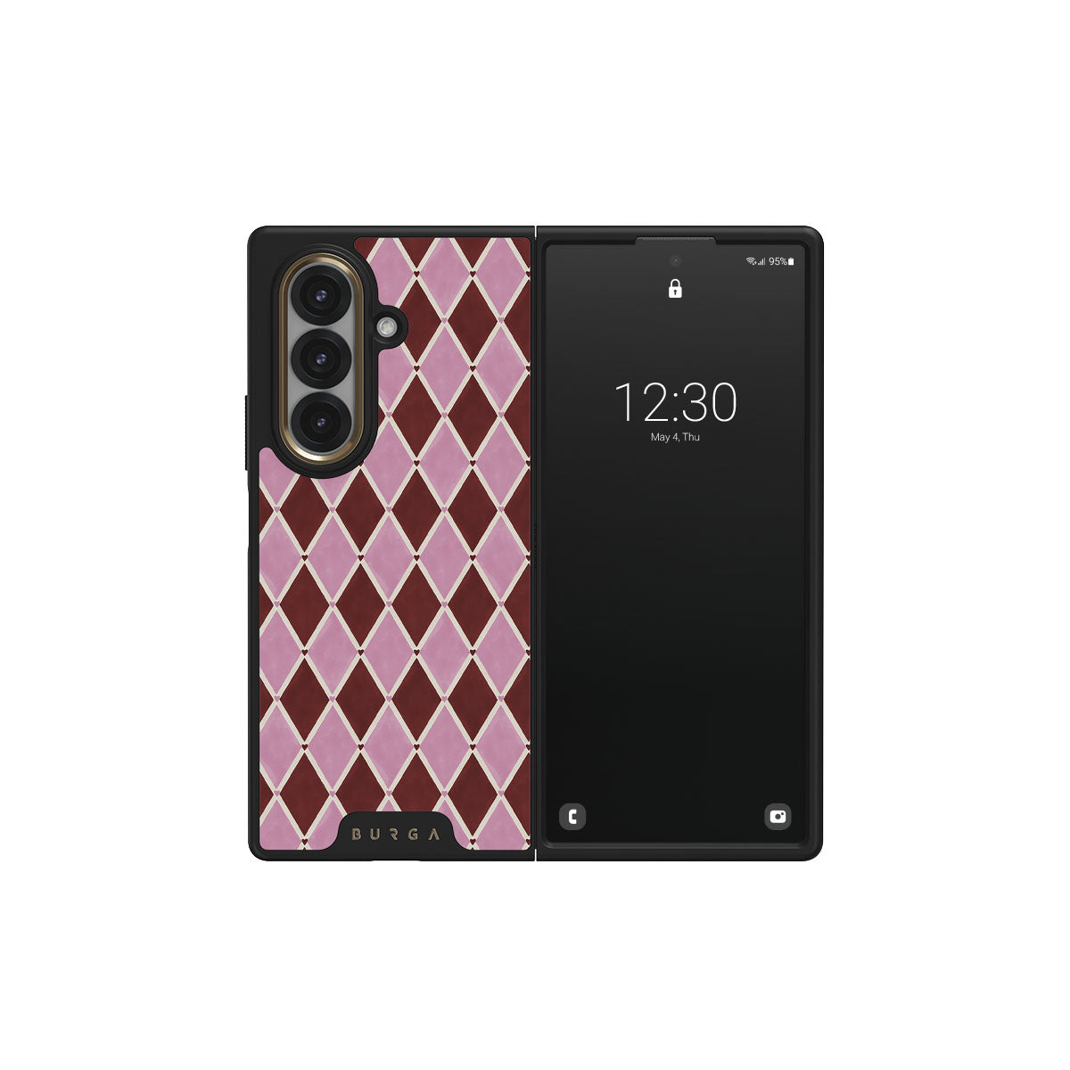 En este diseño: patrón de arlequín, diamantes rosas, fondo rojo profundo