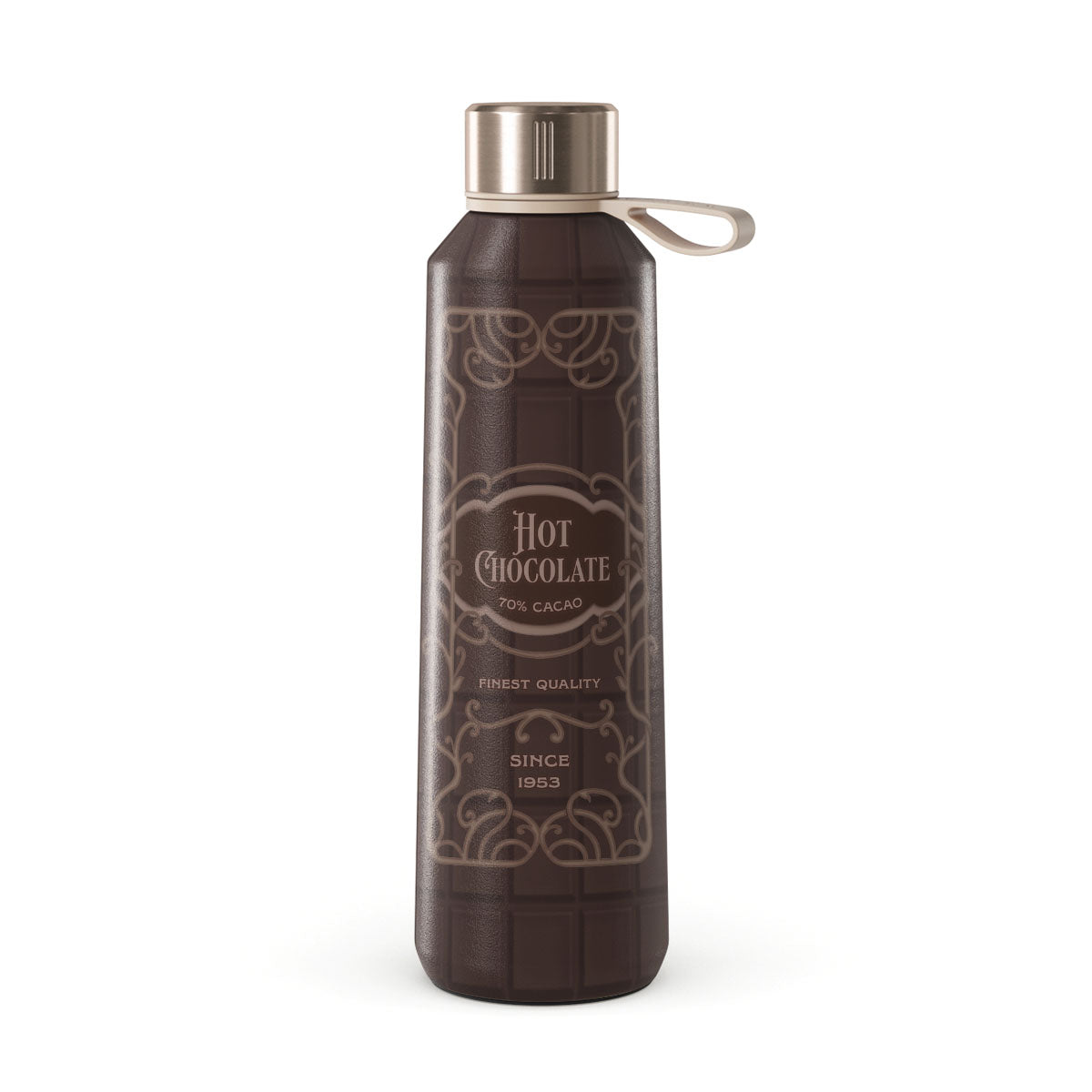 En este diseño: etiqueta de chocolate caliente, diseño de chocolate marrón, estilo retro de empaquetado