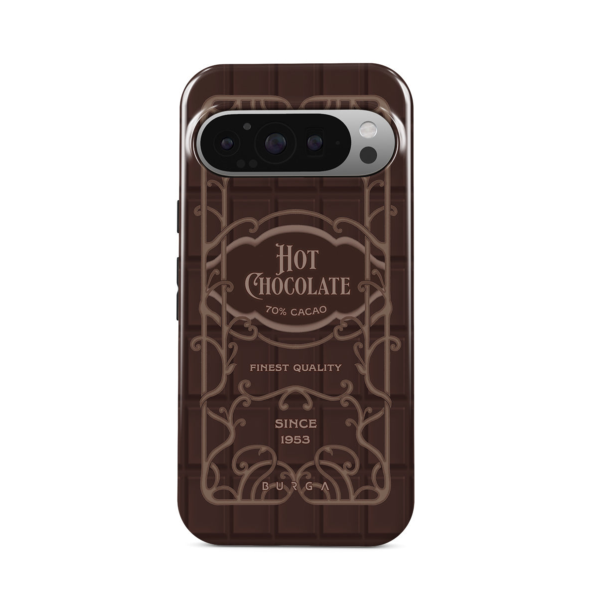 En este diseño: etiqueta de chocolate caliente, diseño de chocolate marrón, estilo retro de empaquetado
