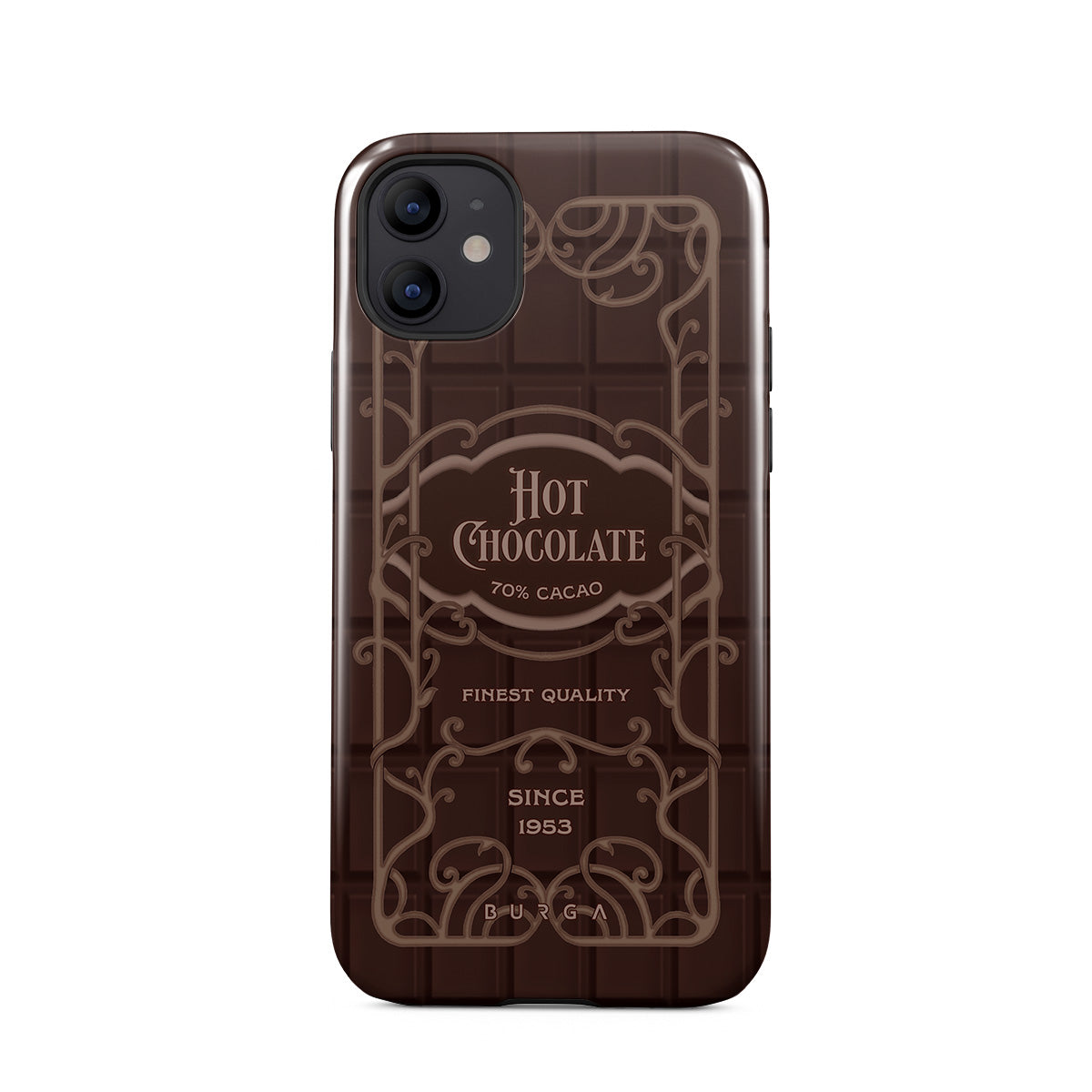 En este diseño: etiqueta de chocolate caliente, diseño de chocolate marrón, estilo retro de empaquetado