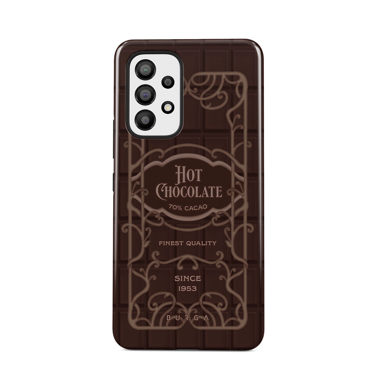 En este diseño: etiqueta de chocolate caliente, diseño de chocolate marrón, estilo retro de empaquetado