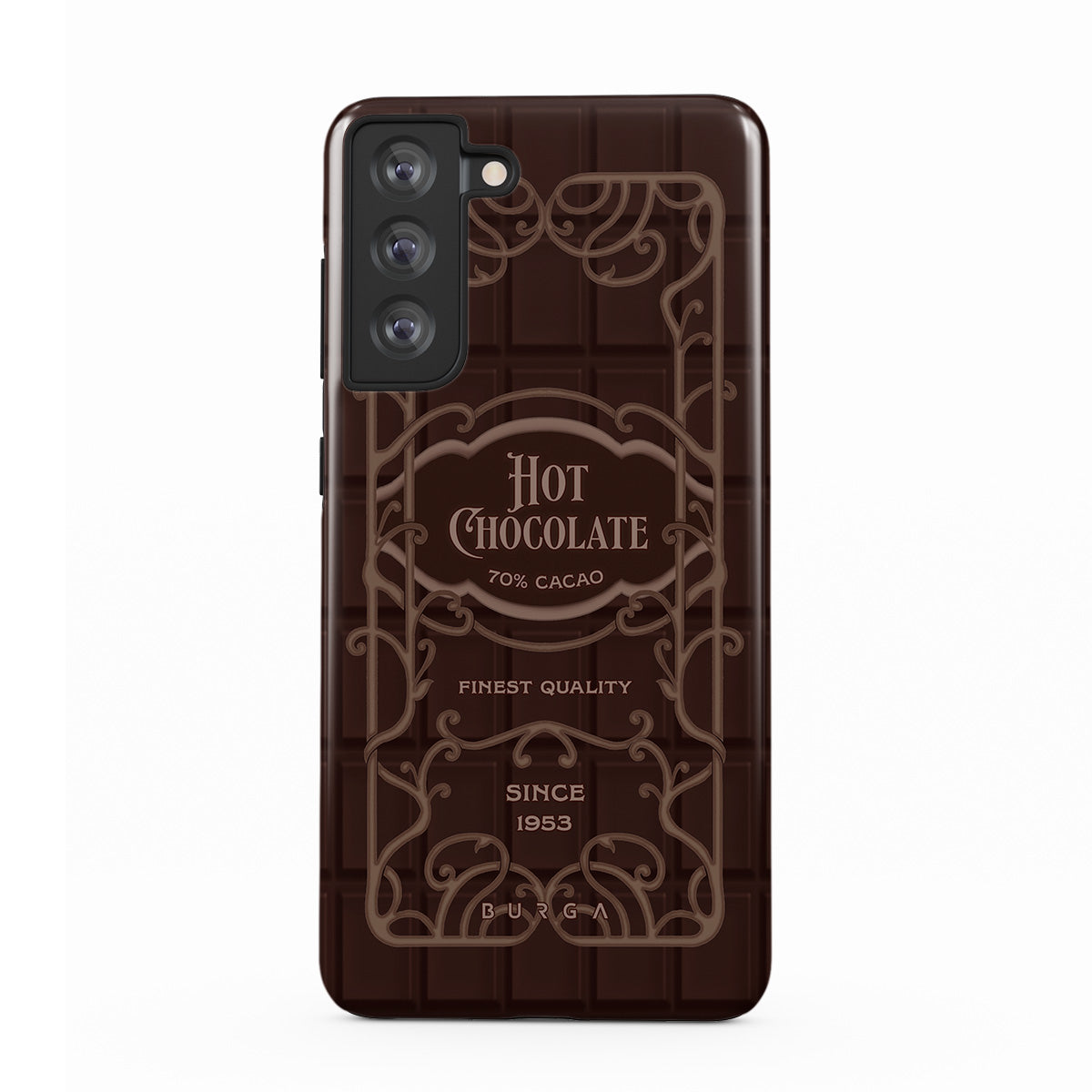 En este diseño: etiqueta de chocolate caliente, diseño de chocolate marrón, estilo retro de empaquetado