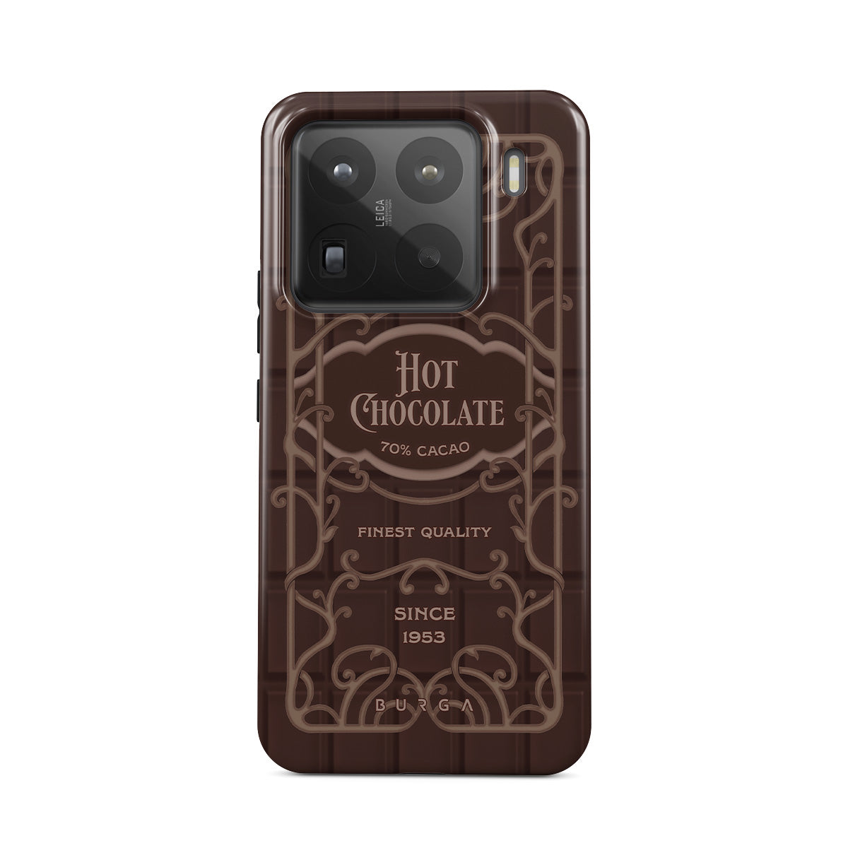 En este diseño: etiqueta de chocolate caliente, diseño de chocolate marrón, estilo retro de empaquetado