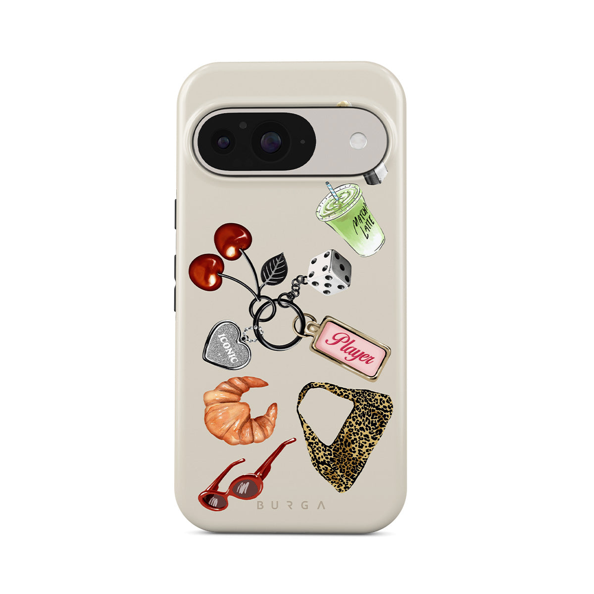 En este diseño: gafas de sol rojas, pintalabios rojo, bebida de matcha verde, croissant, dados negros, bolso de estampado de leopardo, llavero con corazón plateado, cerezas, dados y etiqueta "Player".