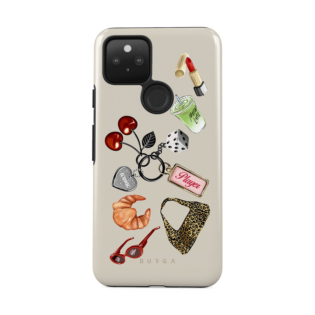 En este diseño: gafas de sol rojas, pintalabios rojo, bebida de matcha verde, croissant, dados negros, bolso de estampado de leopardo, llavero con corazón plateado, cerezas, dados y etiqueta "Player".