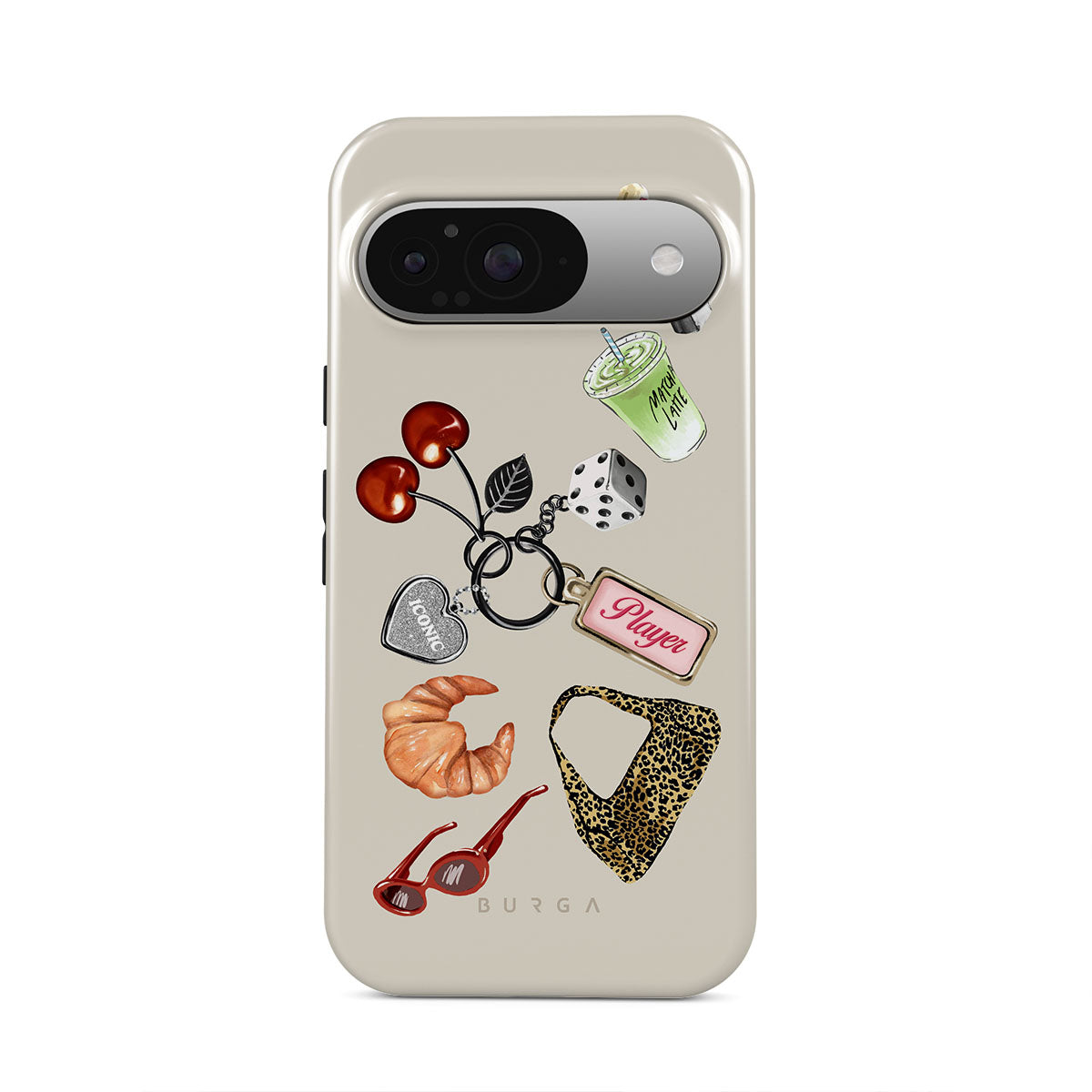 En este diseño: gafas de sol rojas, pintalabios rojo, bebida de matcha verde, croissant, dados negros, bolso de estampado de leopardo, llavero con corazón plateado, cerezas, dados y etiqueta "Player".