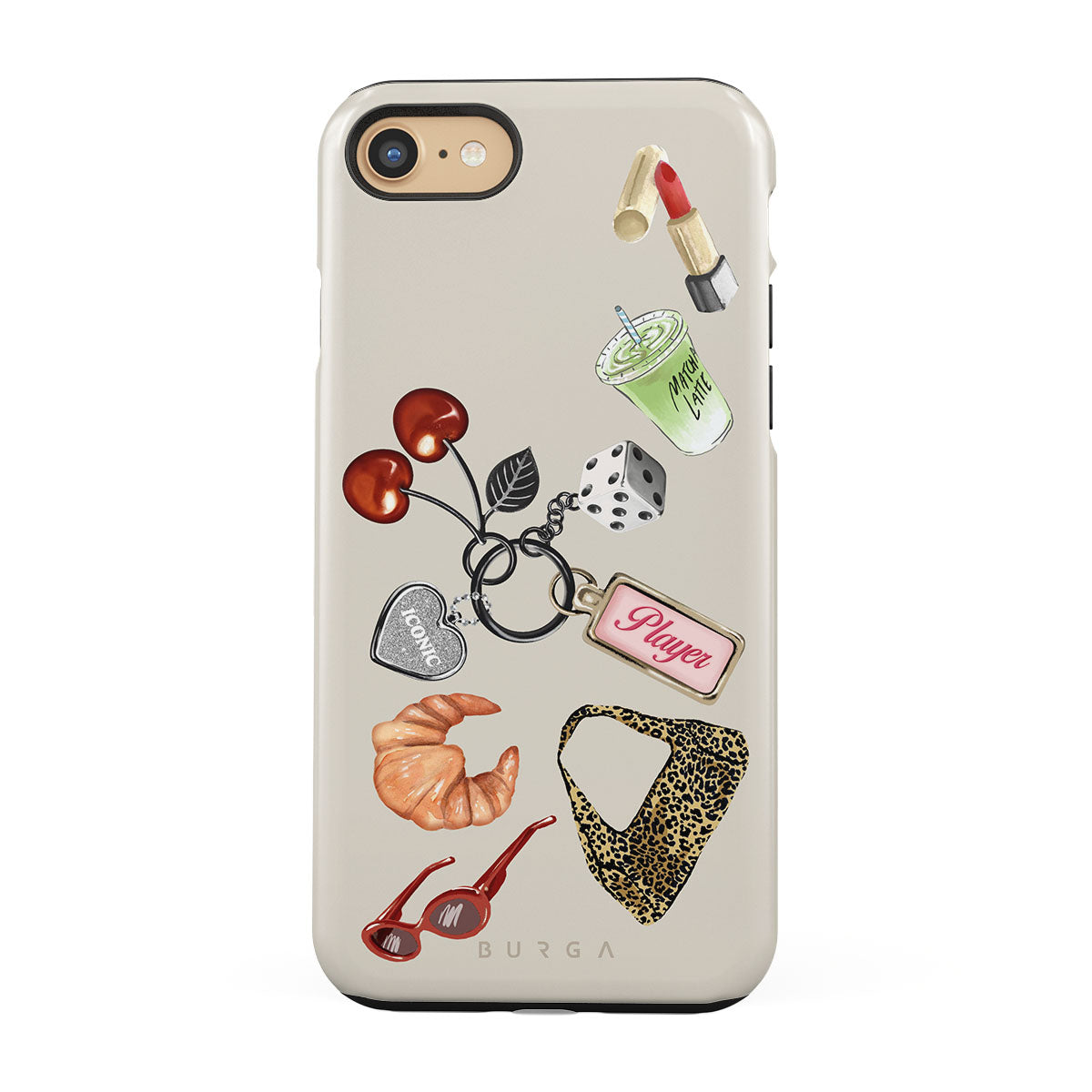 En este diseño: gafas de sol rojas, pintalabios rojo, bebida de matcha verde, croissant, dados negros, bolso de estampado de leopardo, llavero con corazón plateado, cerezas, dados y etiqueta "Player".