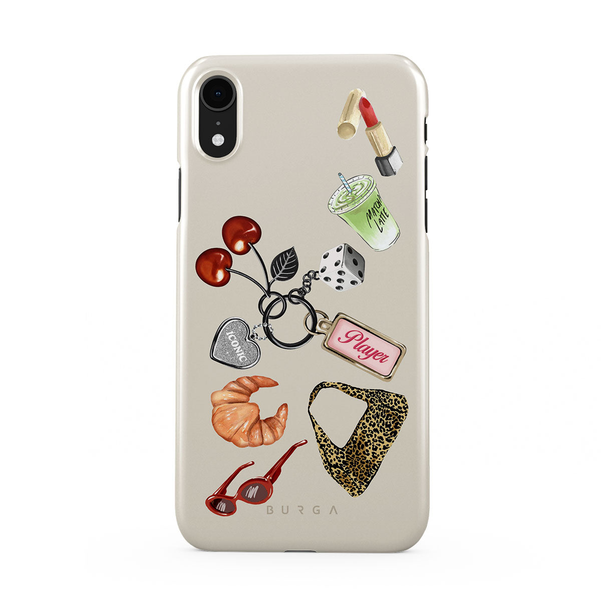 En este diseño: gafas de sol rojas, pintalabios rojo, bebida de matcha verde, croissant, dados negros, bolso de estampado de leopardo, llavero con corazón plateado, cerezas, dados y etiqueta "Player".