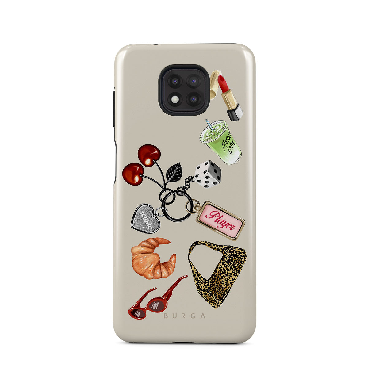 En este diseño: gafas de sol rojas, pintalabios rojo, bebida de matcha verde, croissant, dados negros, bolso de estampado de leopardo, llavero con corazón plateado, cerezas, dados y etiqueta "Player".