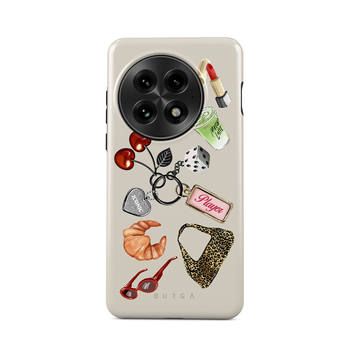 En este diseño: gafas de sol rojas, pintalabios rojo, bebida de matcha verde, croissant, dados negros, bolso de estampado de leopardo, llavero con corazón plateado, cerezas, dados y etiqueta "Player".