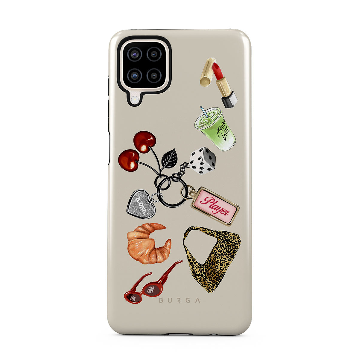 En este diseño: gafas de sol rojas, pintalabios rojo, bebida de matcha verde, croissant, dados negros, bolso de estampado de leopardo, llavero con corazón plateado, cerezas, dados y etiqueta "Player".