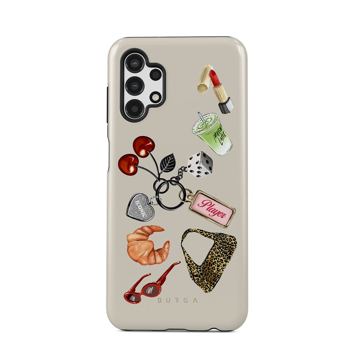 En este diseño: gafas de sol rojas, pintalabios rojo, bebida de matcha verde, croissant, dados negros, bolso de estampado de leopardo, llavero con corazón plateado, cerezas, dados y etiqueta "Player".