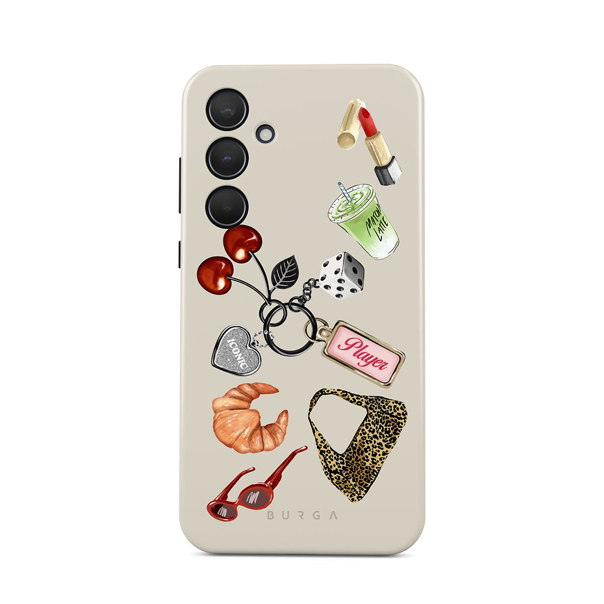 En este diseño: gafas de sol rojas, pintalabios rojo, bebida de matcha verde, croissant, dados negros, bolso de estampado de leopardo, llavero con corazón plateado, cerezas, dados y etiqueta "Player".