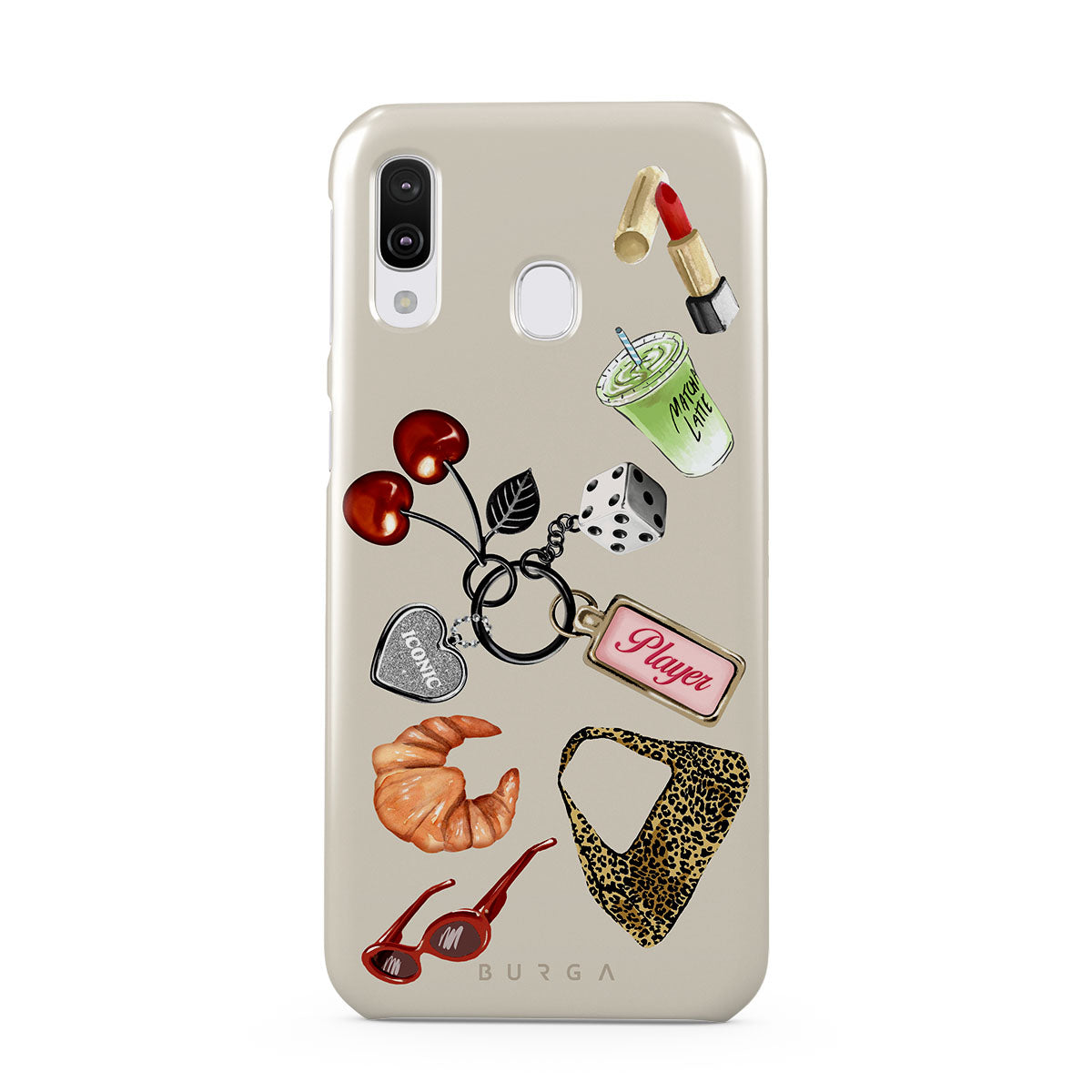 En este diseño: gafas de sol rojas, pintalabios rojo, bebida de matcha verde, croissant, dados negros, bolso de estampado de leopardo, llavero con corazón plateado, cerezas, dados y etiqueta "Player".