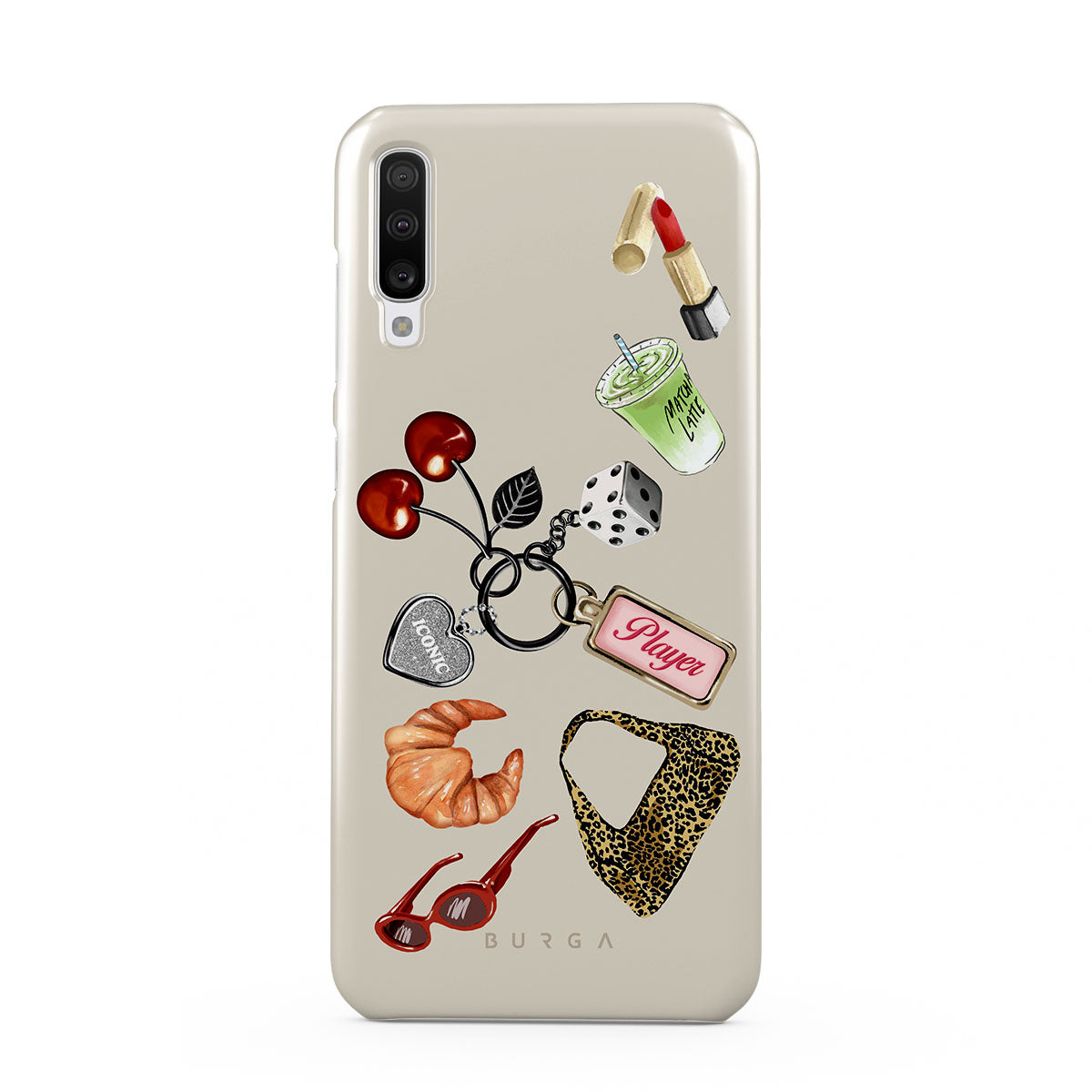 En este diseño: gafas de sol rojas, pintalabios rojo, bebida de matcha verde, croissant, dados negros, bolso de estampado de leopardo, llavero con corazón plateado, cerezas, dados y etiqueta "Player".
