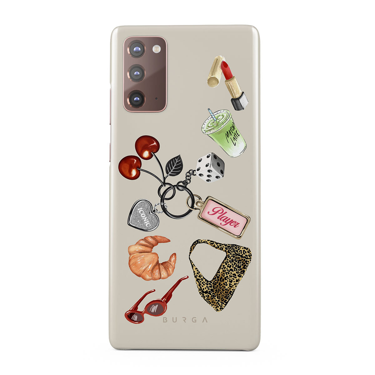 En este diseño: gafas de sol rojas, pintalabios rojo, bebida de matcha verde, croissant, dados negros, bolso de estampado de leopardo, llavero con corazón plateado, cerezas, dados y etiqueta "Player".