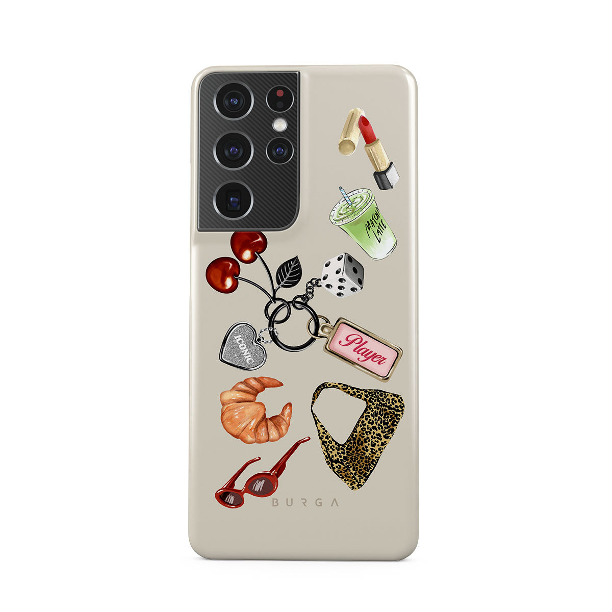 En este diseño: gafas de sol rojas, pintalabios rojo, bebida de matcha verde, croissant, dados negros, bolso de estampado de leopardo, llavero con corazón plateado, cerezas, dados y etiqueta "Player".
