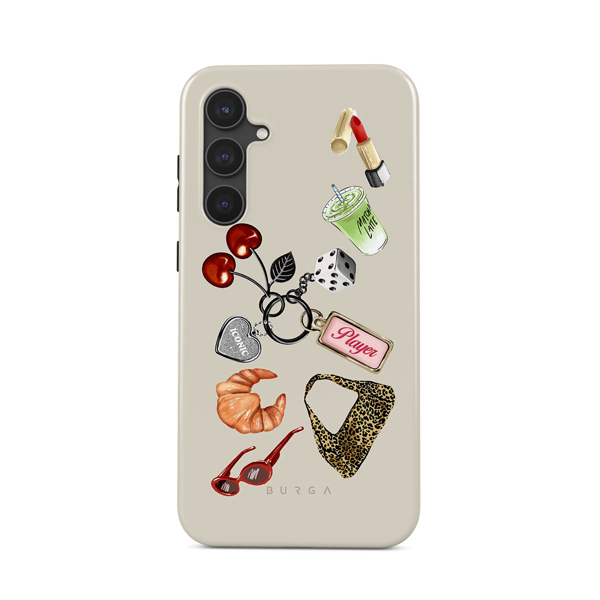 En este diseño: gafas de sol rojas, pintalabios rojo, bebida de matcha verde, croissant, dados negros, bolso de estampado de leopardo, llavero con corazón plateado, cerezas, dados y etiqueta "Player".