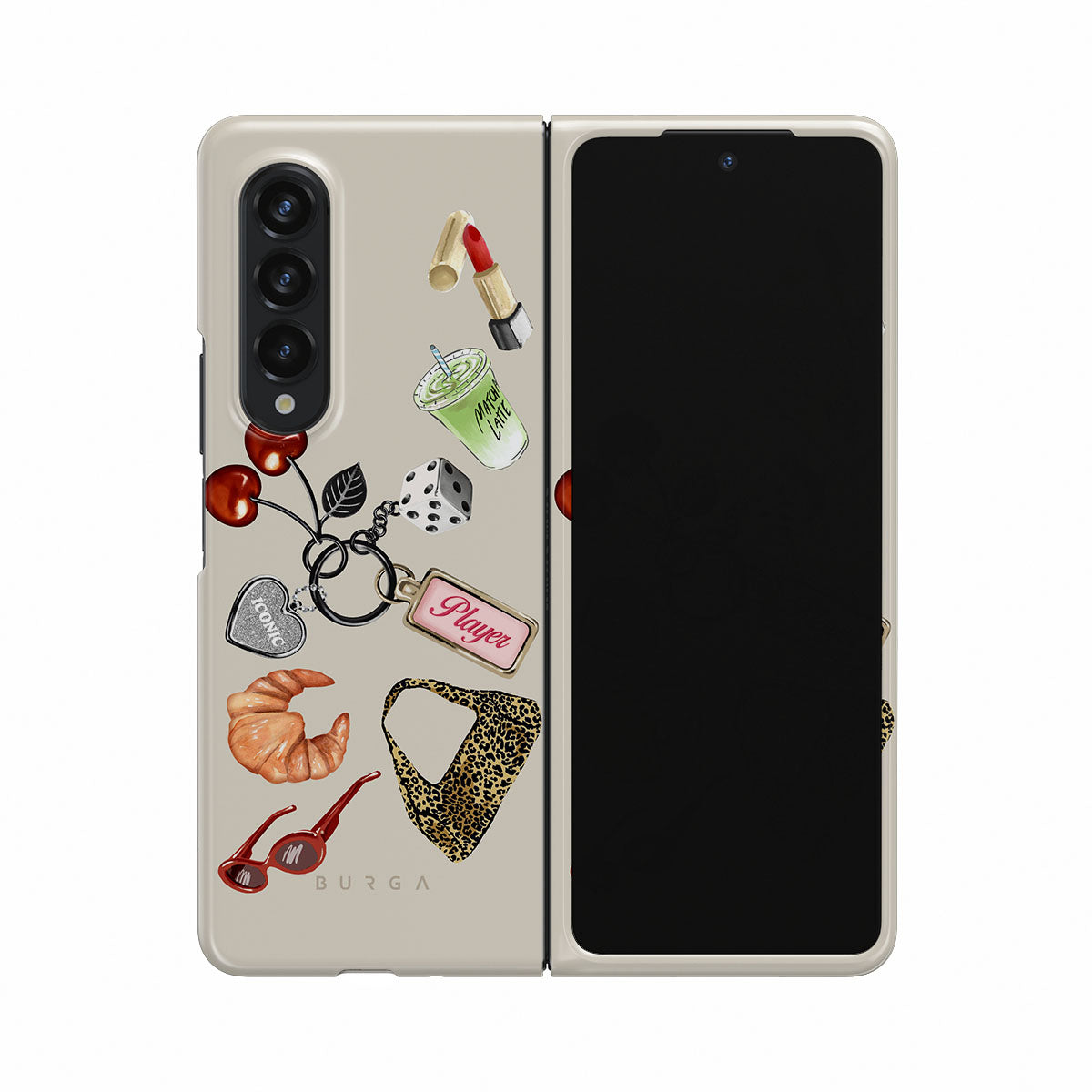 En este diseño: gafas de sol rojas, pintalabios rojo, bebida de matcha verde, croissant, dados negros, bolso de estampado de leopardo, llavero con corazón plateado, cerezas, dados y etiqueta "Player".