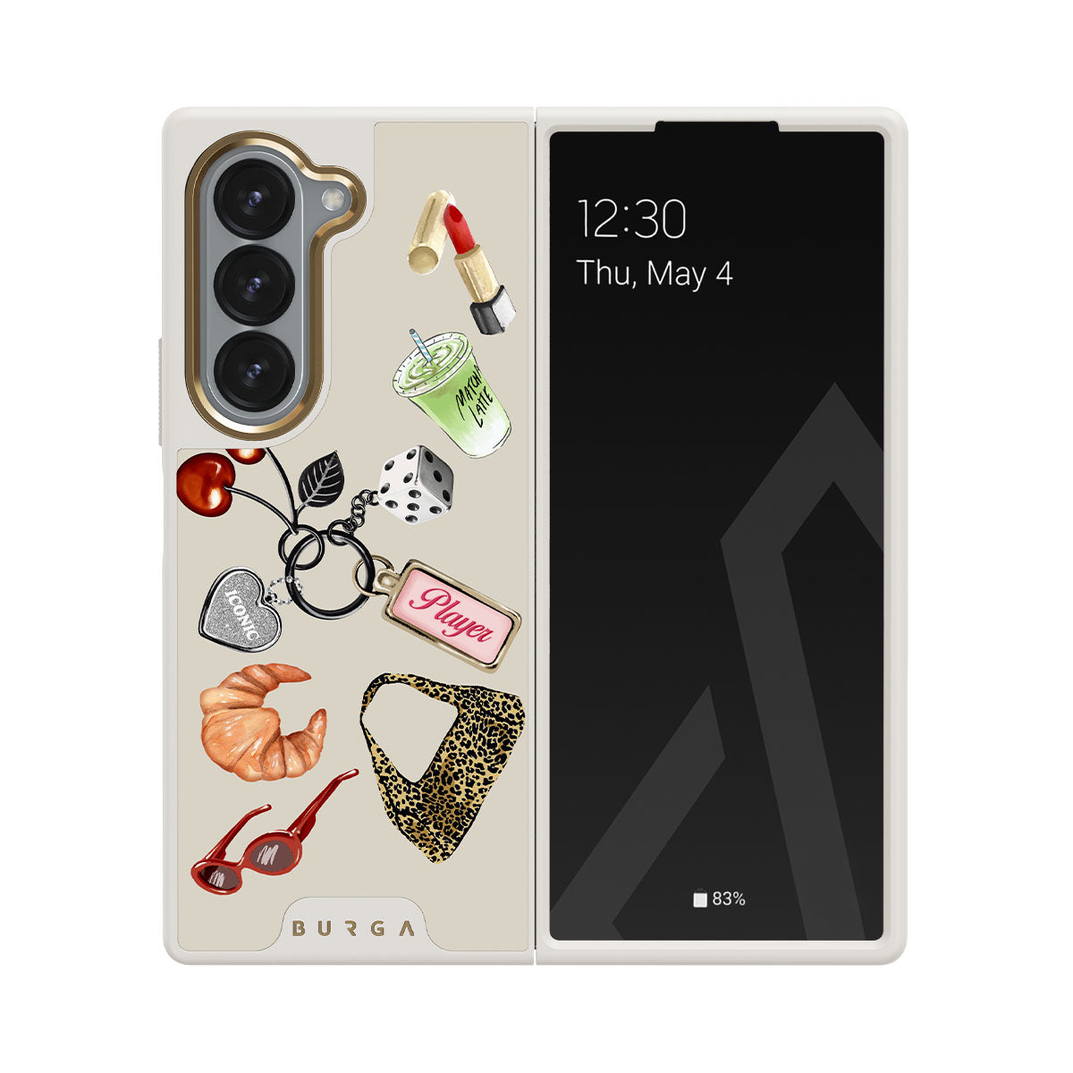 En este diseño: gafas de sol rojas, pintalabios rojo, bebida de matcha verde, croissant, dados negros, bolso de estampado de leopardo, llavero con corazón plateado, cerezas, dados y etiqueta "Player".