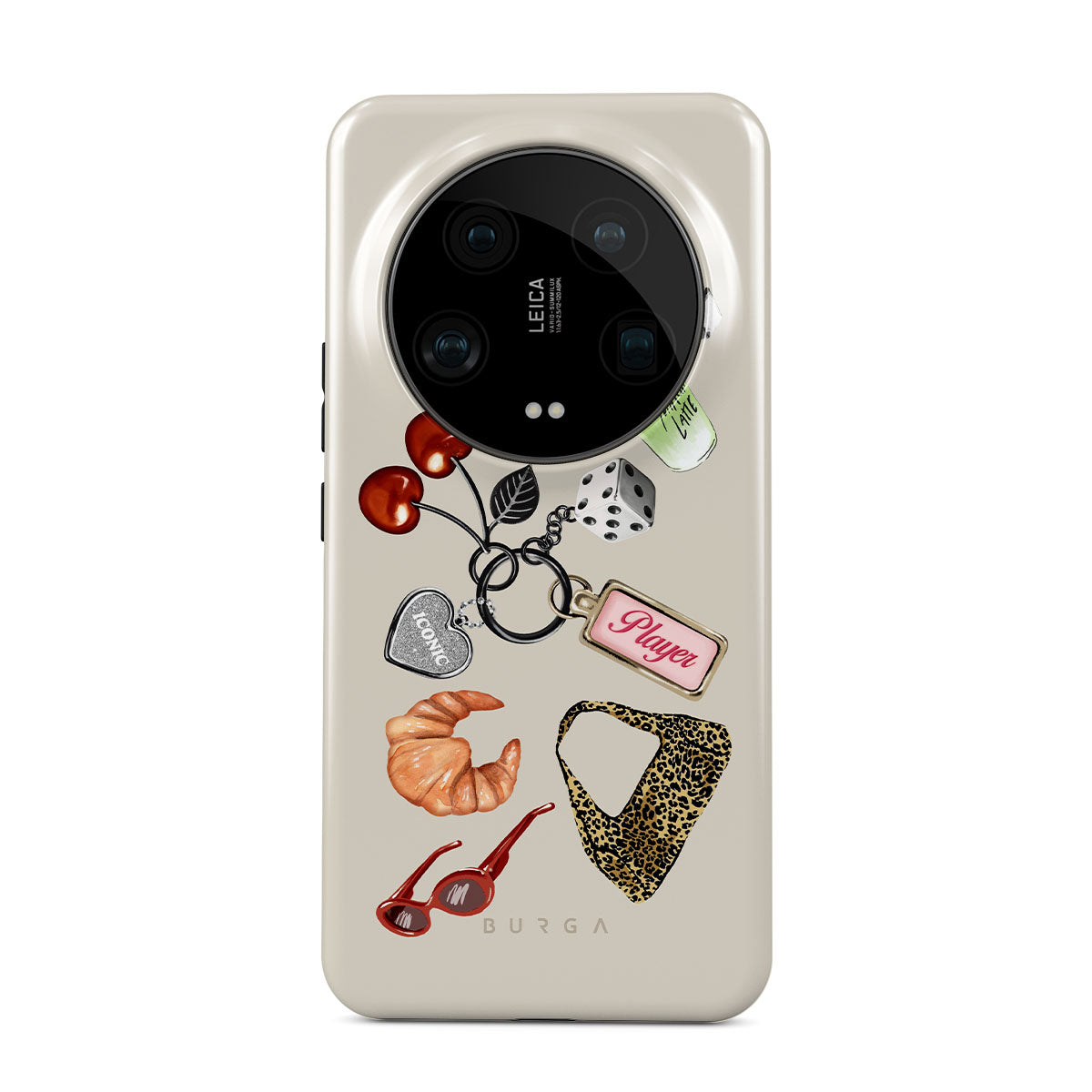 En este diseño: gafas de sol rojas, pintalabios rojo, bebida de matcha verde, croissant, dados negros, bolso de estampado de leopardo, llavero con corazón plateado, cerezas, dados y etiqueta "Player".