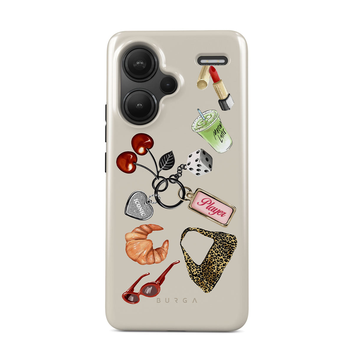 En este diseño: gafas de sol rojas, pintalabios rojo, bebida de matcha verde, croissant, dados negros, bolso de estampado de leopardo, llavero con corazón plateado, cerezas, dados y etiqueta "Player".