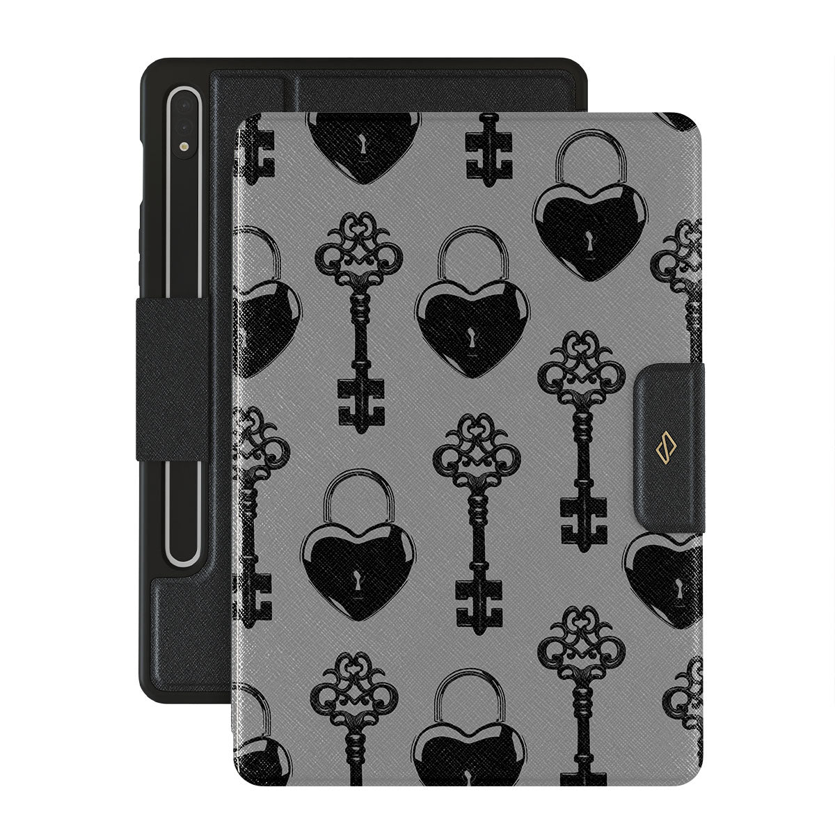 En este diseño: cerraduras ornamentadas, llaves vintage y detalles en negro.