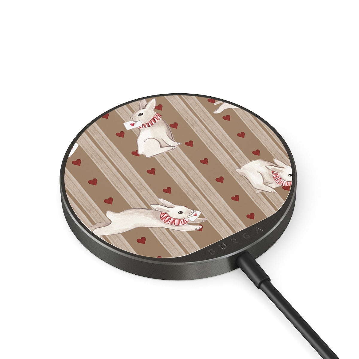 En este diseño: conejos blancos, corazones, amor, cartas, rayas vintage