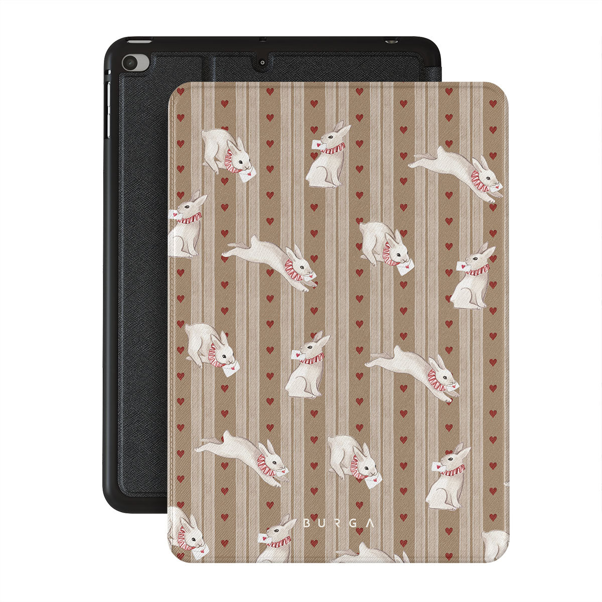 En este diseño: conejos blancos, corazones, amor, cartas, rayas vintage