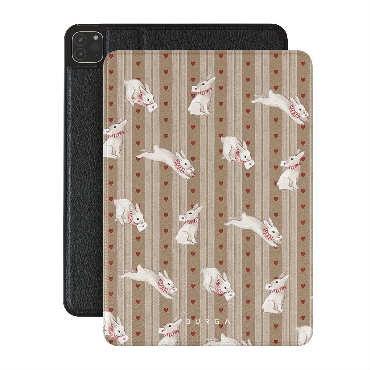 En este diseño: conejos blancos, corazones, amor, cartas, rayas vintage