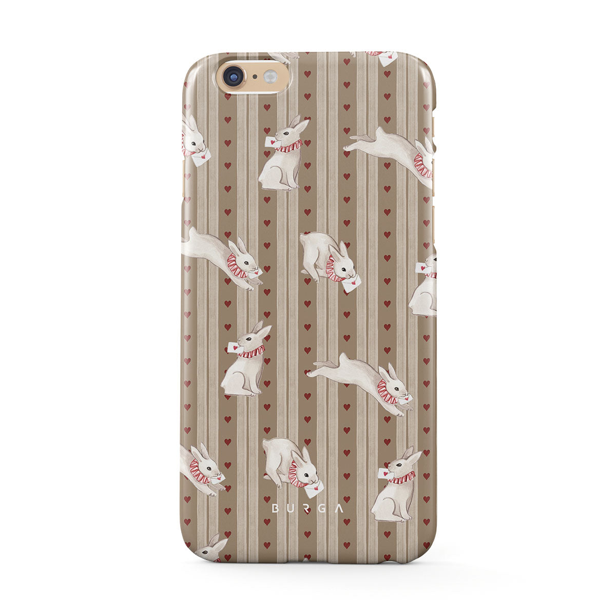 En este diseño: conejos blancos, corazones, amor, cartas, rayas vintage