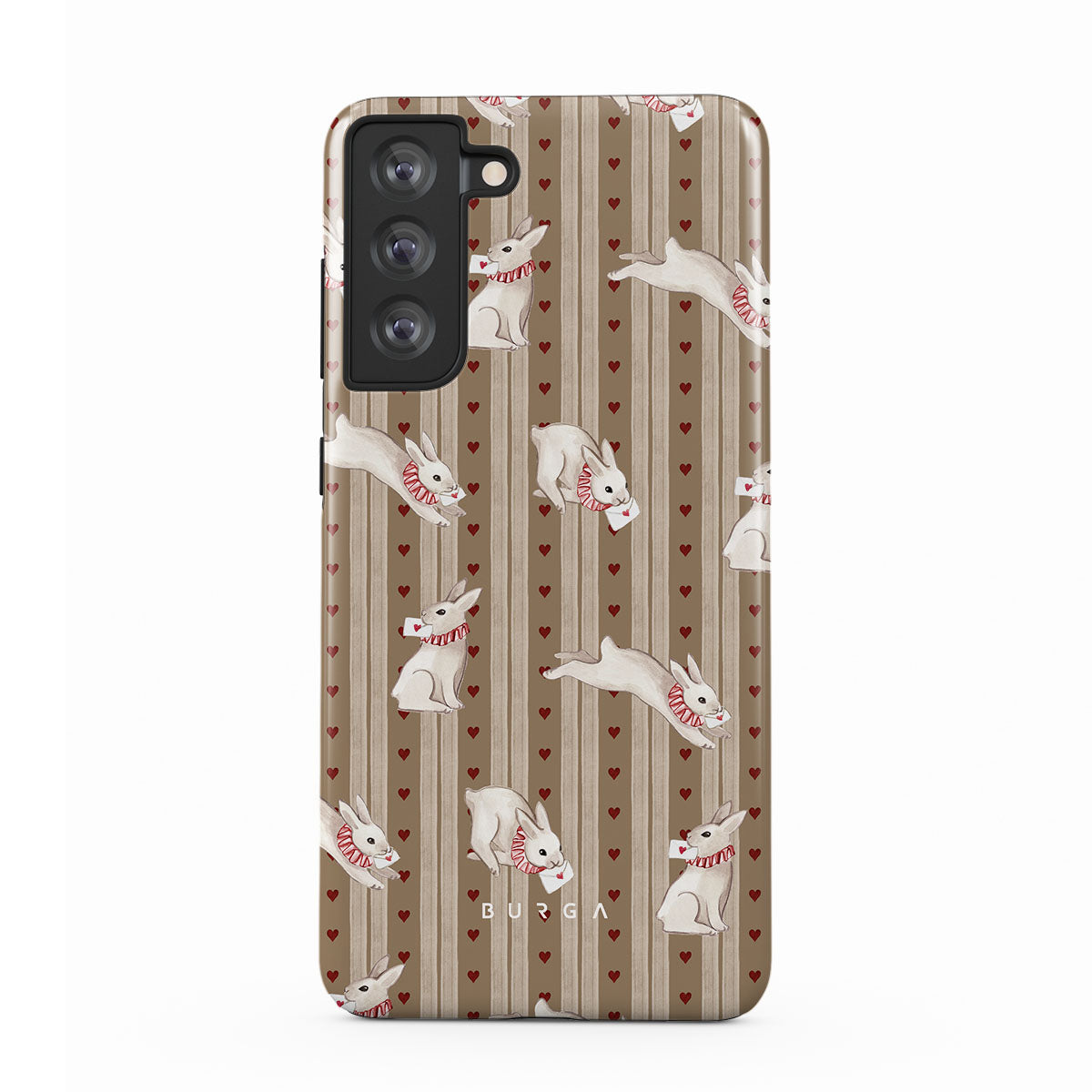 En este diseño: conejos blancos, corazones, amor, cartas, rayas vintage