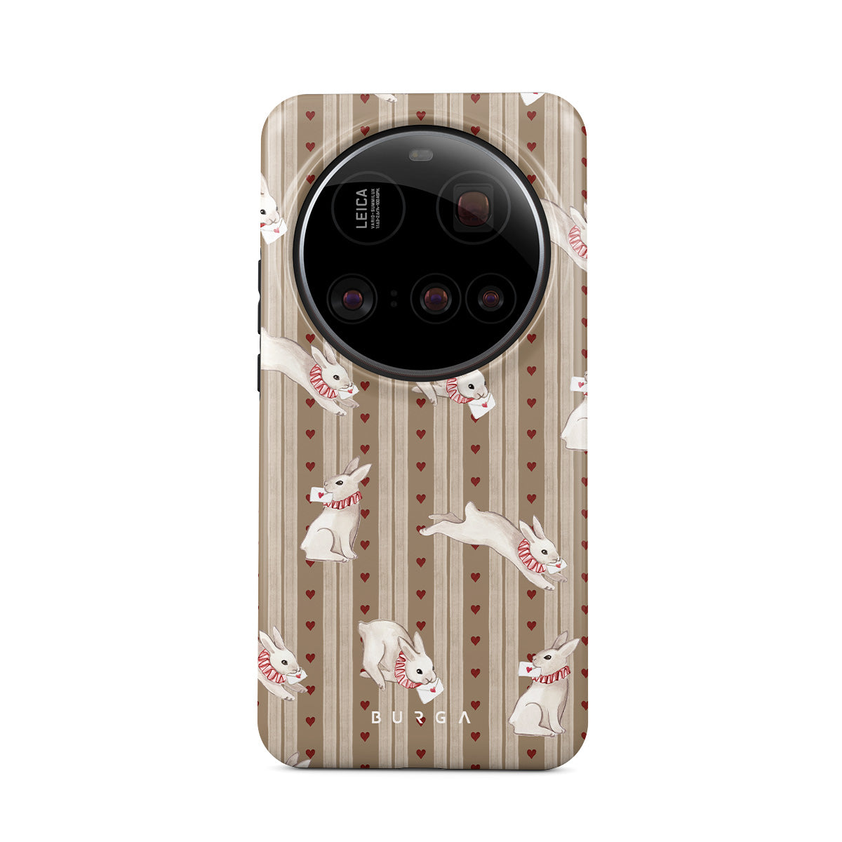 En este diseño: conejos blancos, corazones, amor, cartas, rayas vintage