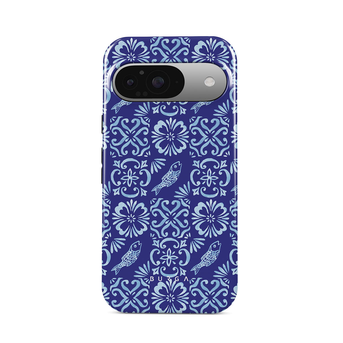 En este diseño: patrones de azulejos portugueses, azules profundos, patrones florales, flores, peces
