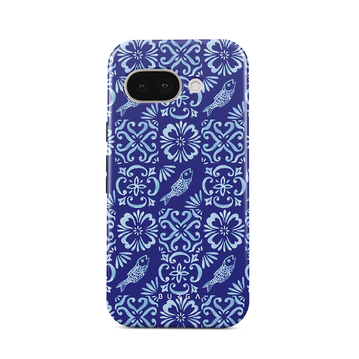 En este diseño: patrones de azulejos portugueses, azules profundos, patrones florales, flores, peces