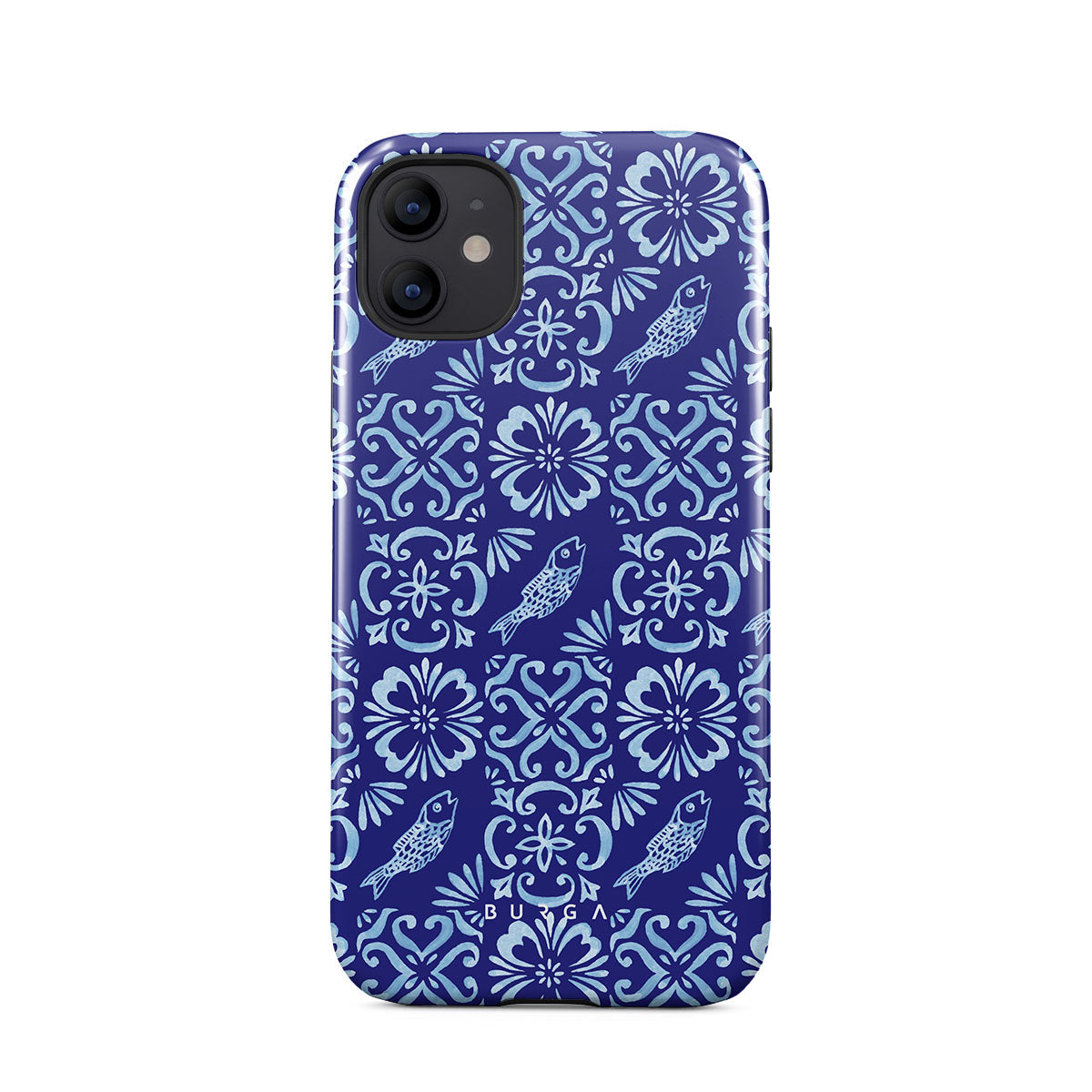 En este diseño: patrones de azulejos portugueses, azules profundos, patrones florales, flores, peces
