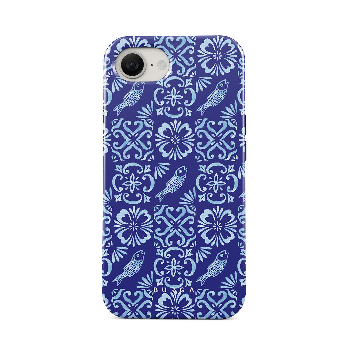 En este diseño: patrones de azulejos portugueses, azules profundos, patrones florales, flores, peces