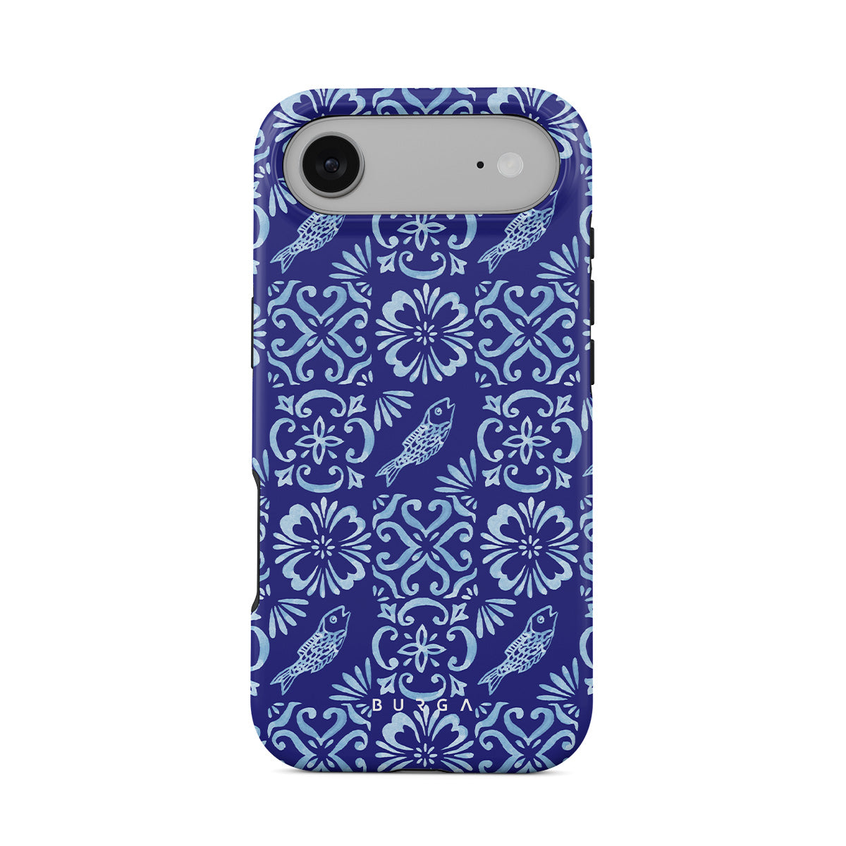En este diseño: patrones de azulejos portugueses, azules profundos, patrones florales, flores, peces