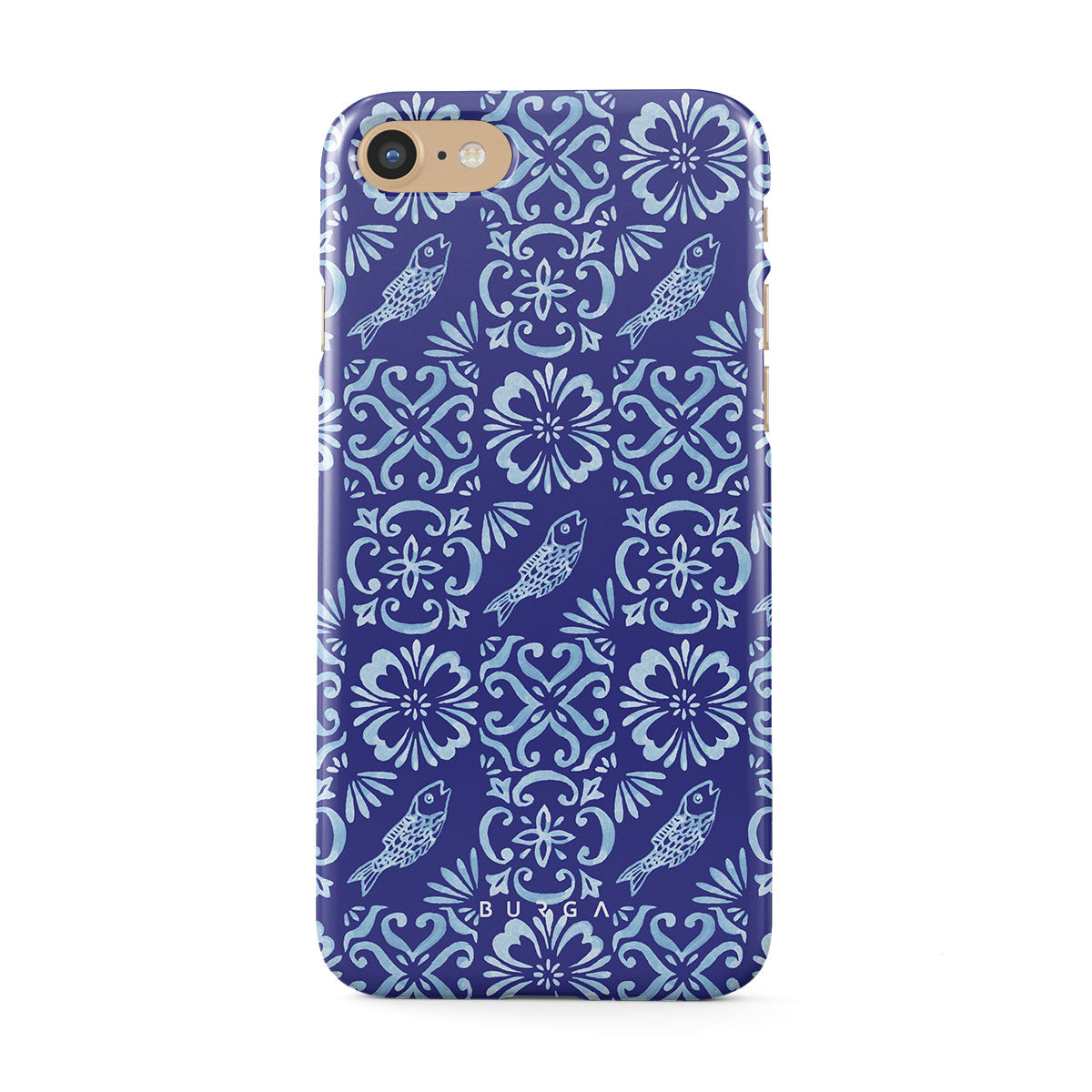 En este diseño: patrones de azulejos portugueses, azules profundos, patrones florales, flores, peces