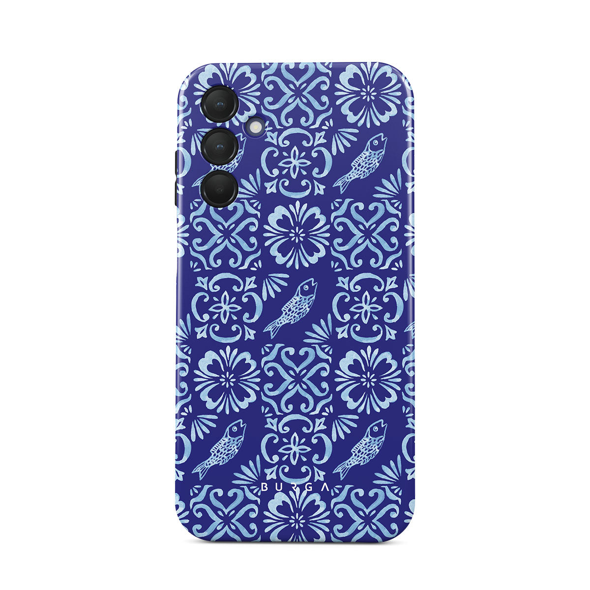 En este diseño: patrones de azulejos portugueses, azules profundos, patrones florales, flores, peces