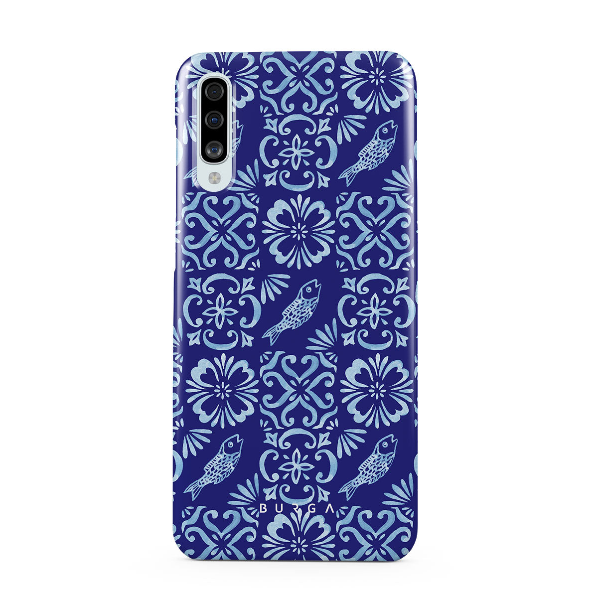En este diseño: patrones de azulejos portugueses, azules profundos, patrones florales, flores, peces