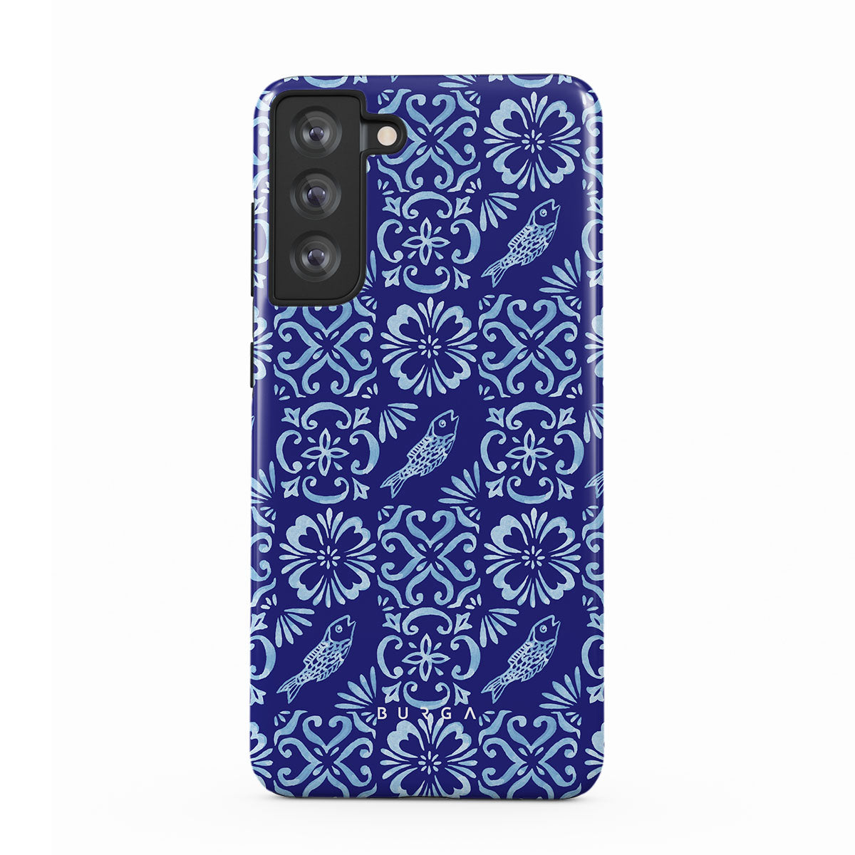 En este diseño: patrones de azulejos portugueses, azules profundos, patrones florales, flores, peces