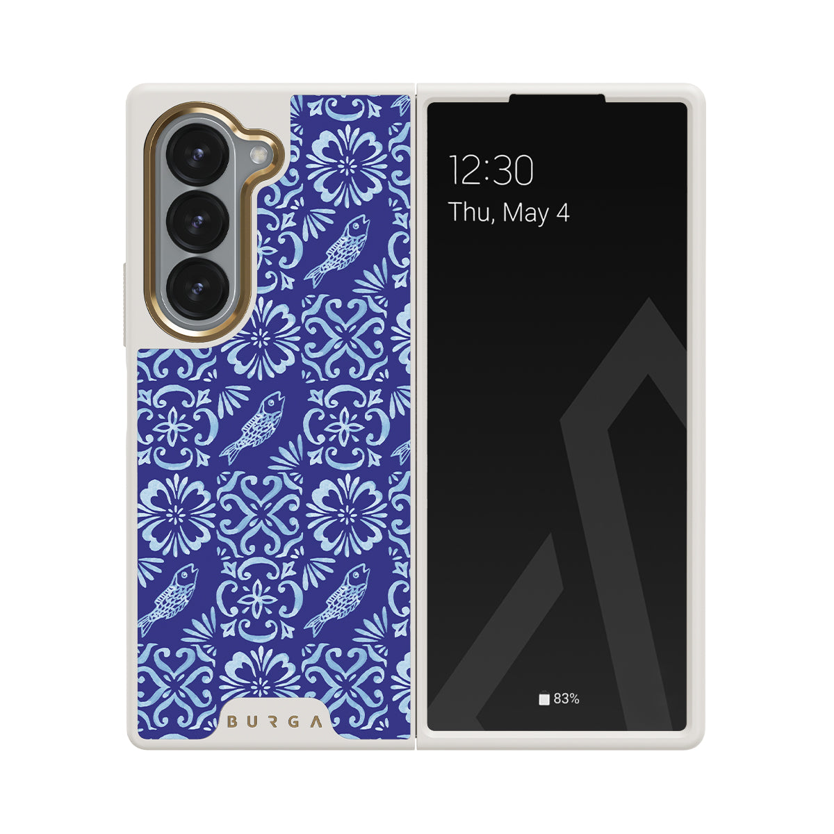 En este diseño: patrones de azulejos portugueses, azules profundos, patrones florales, flores, peces