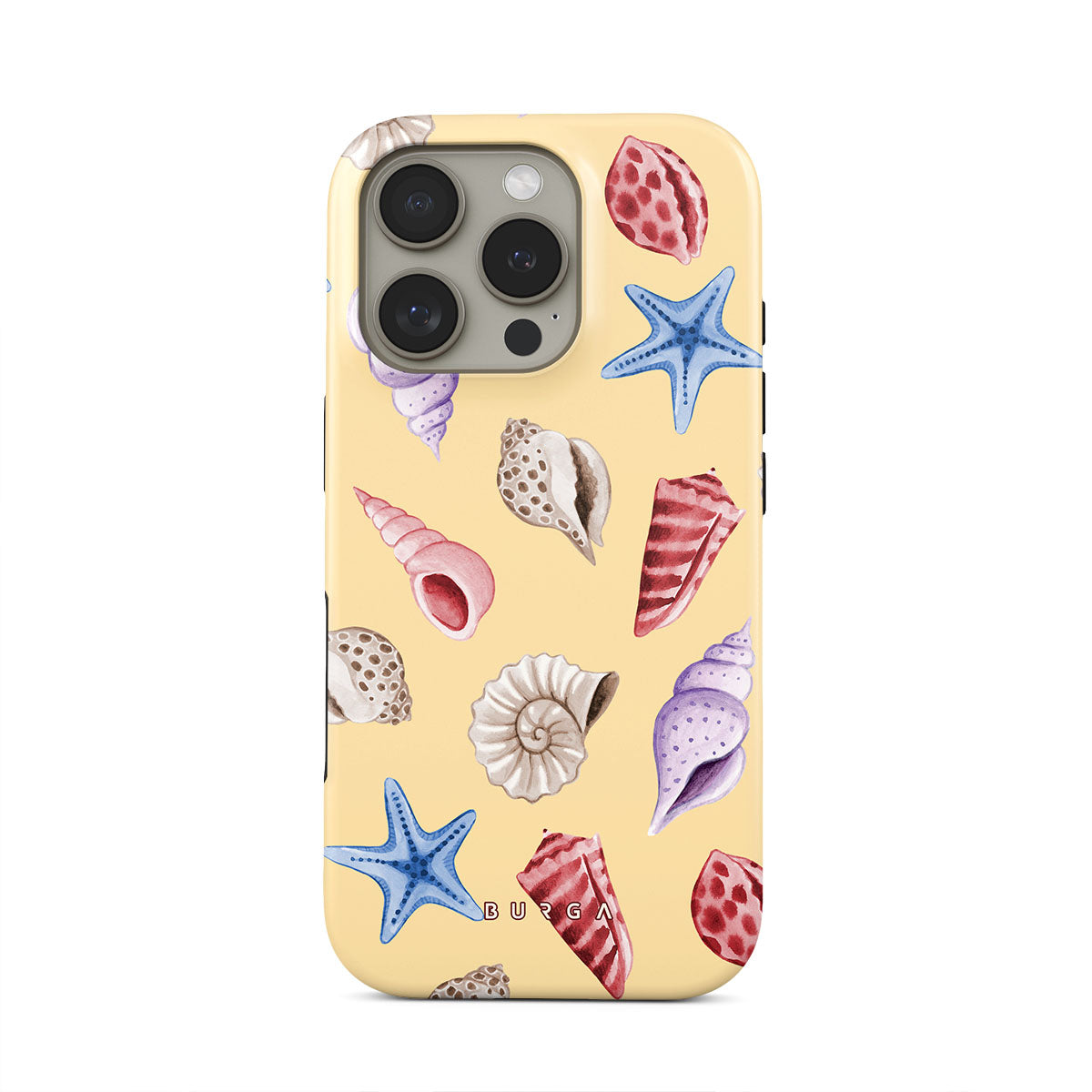En este diseño: conchas, estrellas de mar, fondo amarillo pastel, tema oceánico.